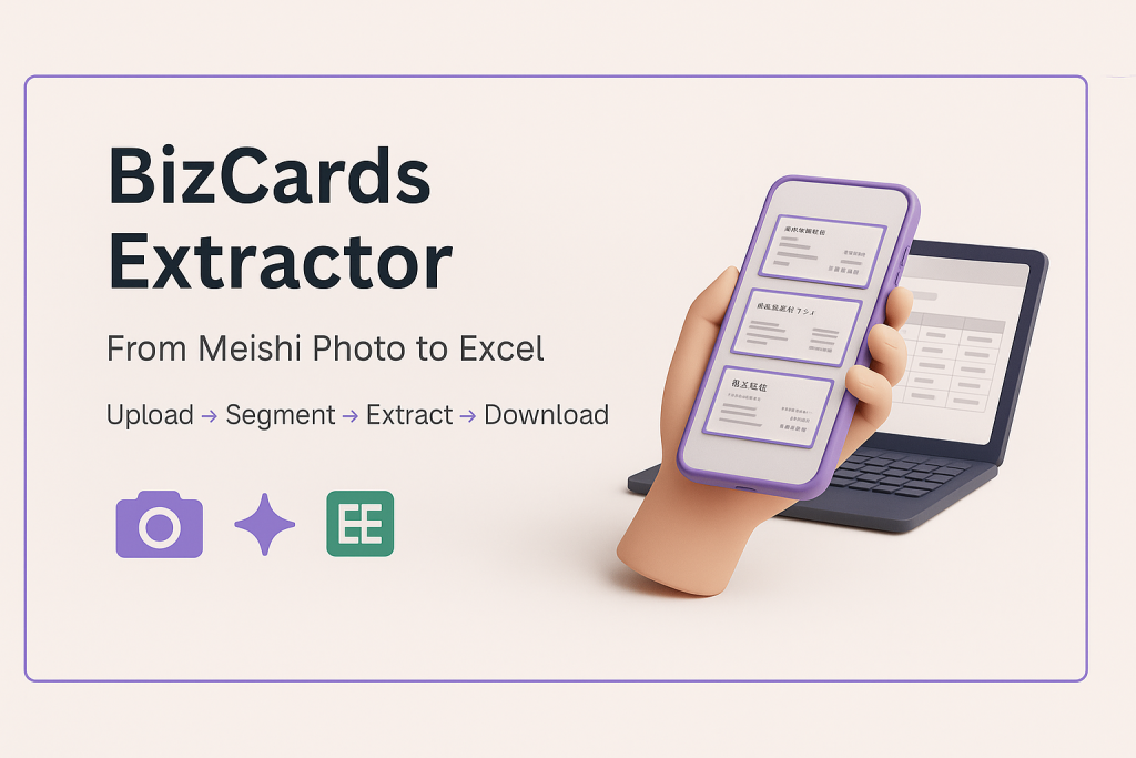 BizCards Extractor turns stacks of meishi into a tidy, shareable spreadsheet in minutes. Upload the photo, let the app find and read the cards, then download the list—simple, fast, and built for how business is actually done in Japan.
